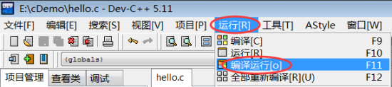 在上方菜单栏中选择“运行 --> 编译”,就可以完成 hello.c 源文件的编译工作。