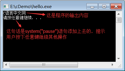 #include<stdio.h>#include<stdlib.h>intmain(){puts("C语言中文网");system("pause");return0;}system("pause");语句的作用就是让程序暂停一下。注意代码开头部分还添加了#include <stdlib.h>语句,否则system("pause");无效。再次编译,运行生成的 hello.exe,终于如愿以偿,看到输出结果了,如下图所示: