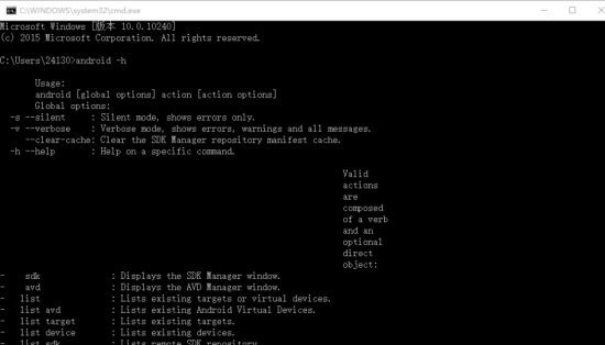 8.打开cmd窗口,输入“android -h”命令,弹出如下图所示的信息,表示设置成功。