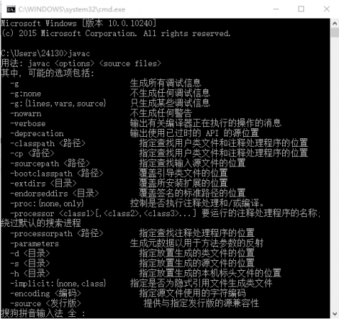 6.测试环境变量是否设置成功,在win10搜索框中输入cmd,打开命令行,在命令行中输入javac,显示如图的内容,说明环境变量配置成功。