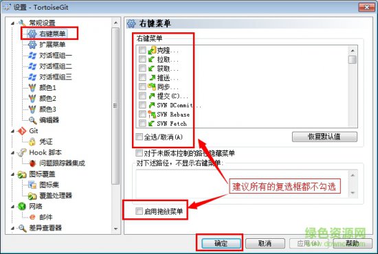 4.上面操作完成后,我们再次鼠标右键,可以看到菜单已经变成中文了,“settings”变成了“设置”,“slone”变成了“克隆”;再次打开配置菜单,选择“右键菜单”,去掉所有的勾选(如图),点击“确定”