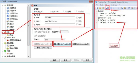 点击 “编辑全局 .git/config(o)”按钮,会使用记事本打开全局配置文件,在全局配置文件中,在后面加上下面的内容: