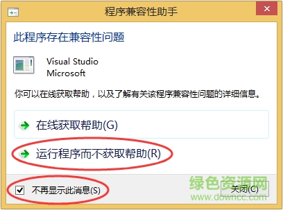 在VC6.0运行过程中,如果弹出下面的兼容性提示框,勾选“不再显示此消息”,关闭即可。