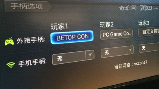 手柄通过USB连到小米盒子后,界面上会提示手柄已经连接,在手柄选项区域也可以看到“玩家1”和“玩家2”下方显示出了这2个手柄的名称。