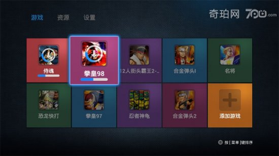 启动应用,可以看到KO GameBox分为游戏、资源和设置三个大频道,游戏频道下已经显示两行游戏:拳皇、合金弹头、恐龙快打、侍魂…都是我们很熟知的经典。
