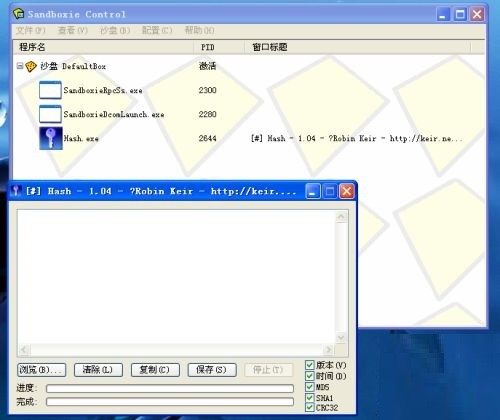 同样先打开沙盘sandboxie主程序,然后鼠标选中并拖动要运行的软件,拖动到sandboxie界面内后,看沙盘主界面中显示的软件进程有没有和所运行的软件不相关的进程,这里以hash软件为例。