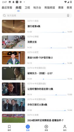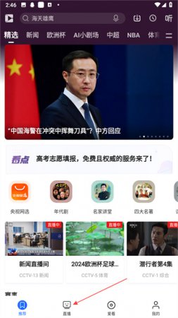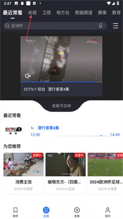 1、通过本站下载央视影音客户端,打开后点击下方频道中的【直播】