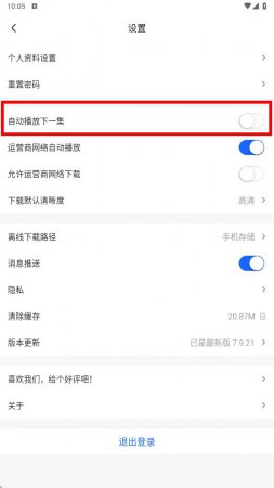3、在设置界面,找到自动播放下一集选项,开启对应的开关即可。