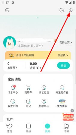 2、在我的页面右上角,点击设置图标齿轮状进入设置界面。