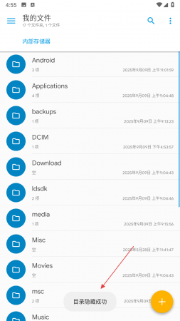 4、执行隐藏操作后,文件夹会从当前文件列表中消失,界面会提示目录隐藏成功,完成文件夹隐藏。
