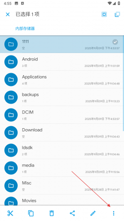 2、选中文件夹后,点击界面右下角的三点更多图标,弹出操作菜单。