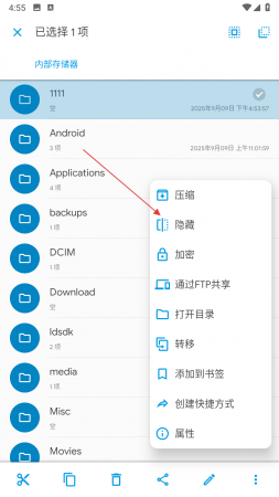 3、在弹出的操作菜单中,点击隐藏选项,对该文件夹执行隐藏操作。