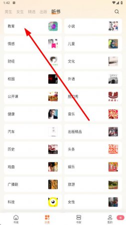 2、进入听书分类页面后,浏览各类听书内容,比如选择教育分类下想听的书籍或音频。