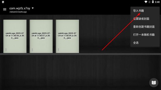 1、进入文件管理界面,点击右上角菜单的导入书籍选项,启动本地书籍导入流程,扩充阅读资源。