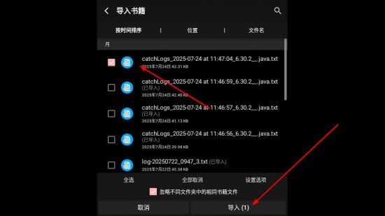 2、在导入界面勾选目标文件如catchLogs格式,点击底部导入按钮,将文件添加至书架,完成资源导入。