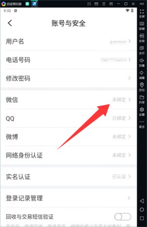 4、在账号与安全功能界面中找到微信选项,点击后方的未绑定,之后跳转到微信app中,用户跟随指引完成绑定即可。