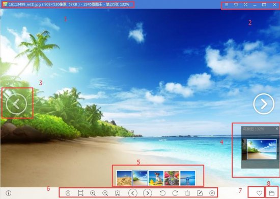 5.缩略图预览界面,当您打开一张图片后,看图窗口中5的位置将会一次性预览当前目录下所有的图片,无须再返回目录,可直接通过缩略图切换图片;