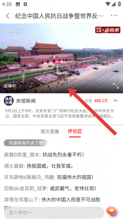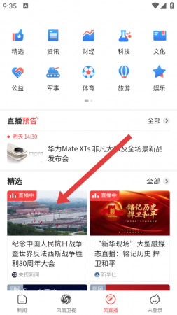 1、打开凤凰视频首页,然后可以选择点击上下的风直播板块,进入直播频道的页面。