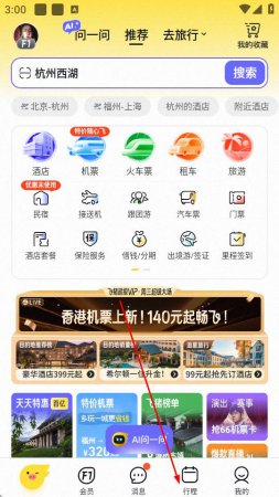 1、打开飞猪旅行APP,点击底部导航栏中的行程选项。