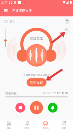 1、在声波清理大师主界面,点击底部导航栏的煲耳机标签,进入煲机功能页面。