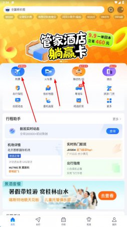 2、切换到“首页”,根据出行需求,点击“机票”“火车票”等对应功能入口,进入预订页面。