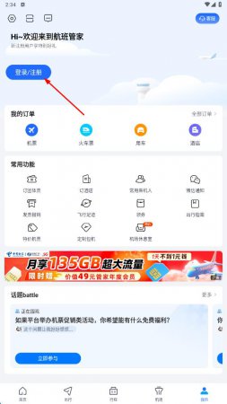 1、打开航班管家APP,在“我的”页面点击“登录/注册”按钮,完成账号登录或注册,进入主界面。