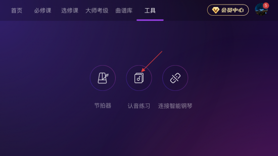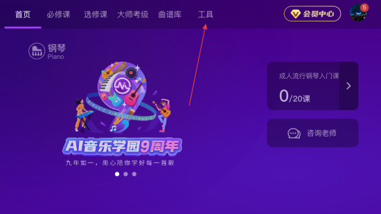 1、打开AI音乐学园APP,点击页面顶部功能栏里的工具选项,进入工具界面。