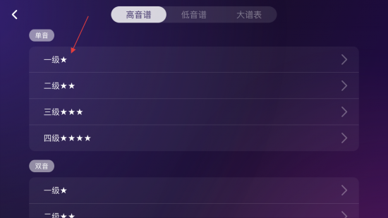 3、进入认音练习选择界面后,能看到谱表分类,以及不同等级,选择合适的等级,点击该等级。