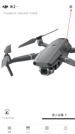 1、打开DJIGO4软件进入主界面,点击界面右上角三条横线图标打开功能菜单。