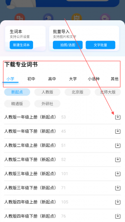 2、在背单词界面的词句收藏板块,点击+号,进入下载专业词书页面,按照小学、初中、高中等分类,选择需要的词书,点击词书右侧下载按钮进行下载。