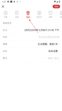 3、在提醒添加页面,点击上方的生日选项,接着输入寿星姓名、生日日期,还能设置提醒时间、与寿星的关系及备注等信息,完成后点击完”按钮,即可成功设置生日提醒。