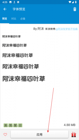 3、字体下载完成后,点击底部应用按钮,按照提示完成字体的应用设置,即可在支持字体更换的应用中使用该字体。
