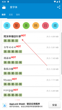 1、打开爱字体应用,在推荐页面中浏览并选择想要使用的字体,点击该字体进入字体预览页面。