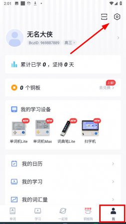 1、打开百词斩app点击底部中的我选项,在个人页面的右上角,点击设置图标,进入设置界面。