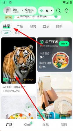 1、打开英语流利说APP,进入广场页面,点击上方待学标签,选择入门词汇-动物与花卉这类课程卡片,开展口语学习。