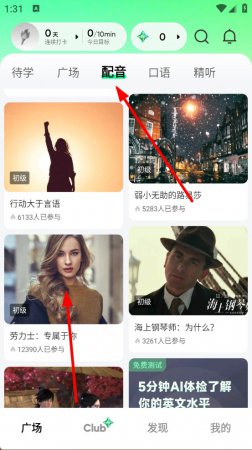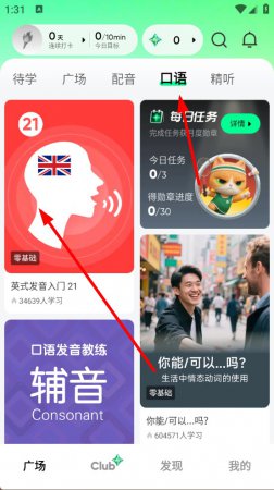 3、切换到广场页面的口语标签,选择英式发音入门21等课程,跟随内容练习口语发音。