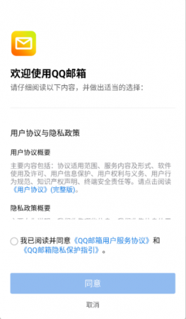 1、首先打开下载好的qq邮箱APP,进入软件后会弹出用户协议与隐私政策,点击查看相应的协议,阅读完毕后点击同意进入;