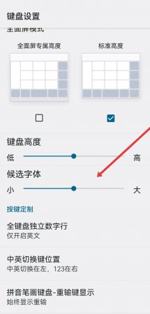 3、在键盘设置界面里,找到候选字体板块,通过拖动下方的滑块来修改字体的大小,调整后即时生效。