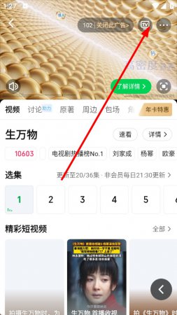 2、在视频播放页面的右上角,点击形似电视图标的投屏按钮,进入投屏搜索界面。