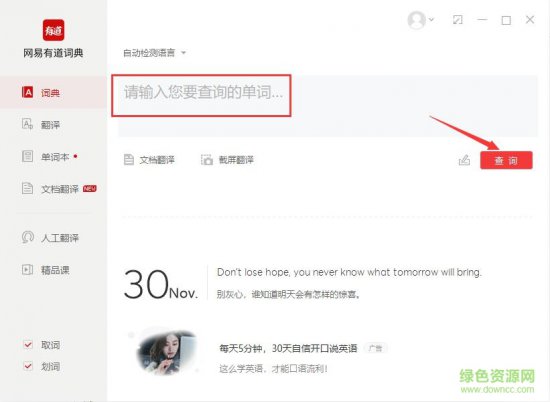 1.打开安装好的有道词典,在软件的左侧菜单中切换到“词典”功能。然后将需要查询的单词输入上方的输入框中,再点击“查询”按钮。