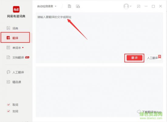1.将有道词典左侧的菜单切换至“翻译”功能,一般中英互译选择“自动监测语言”即可,如有其它与众需求的话,可点开语言选择菜单自行选择。然后将需要翻译的词语、句子或者网址输入上方的输入栏中,再点击“翻译”按钮。