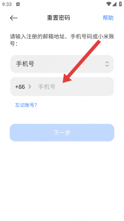 2、在重置密码页面,输入注册所用的邮箱地址、手机号码或小米账号,选择手机号输入框并填写对应号码,然后点击下一步。
