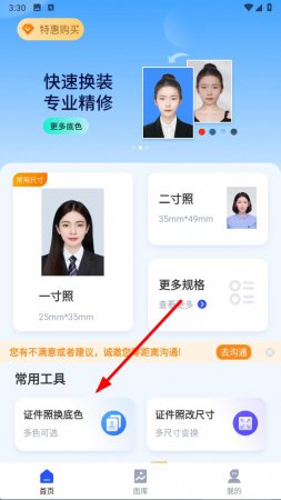 1、打开精美电子证件照app,在首页的常用工具板块中,点击证件照换底色按钮。