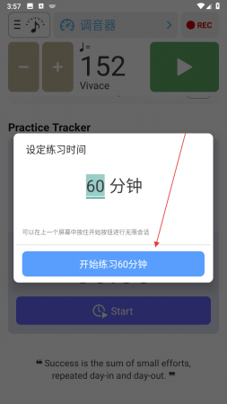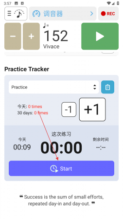 1、打开调音器和节拍器软件找到Practice Tracker区域,点击下方Start按钮准备进行练习计时。