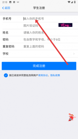 4、在跳转到学生注册页面中,点击输入框依次填写对应信息后即可完成注册操作。
