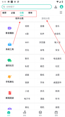 2、点击底部导航栏的软件或游戏,进入界面后选择上方的分类选项,这里将软件和游戏细分为影音播放、系统工具等类别 ,可按分类查找和下载所需内容。