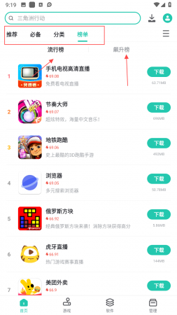3、在底部导航栏选择软件或游戏界面,点击上方榜单选项,能查看流行榜、飙升榜等榜单,了解当前热门的应用和游戏,点击“下载”即可获取榜单上感兴趣的应用或游戏。