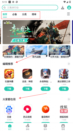 1、打开PP助手进入首页,首页设有推荐等板块,推荐中有编辑推荐和大家都在用的应用,点击下载按钮,就能下载对应的应用和游戏。