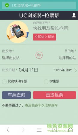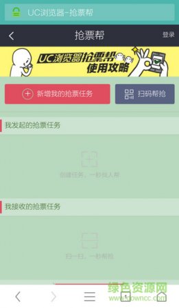 第一步:打开uc浏览器,从手机酷站里点“抢车票”,进入uc抢票专家,需要事先准备好铁道部12306网站的账户密码,然后登录。