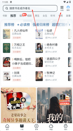 2、点击底部小说选项,进入小说页面,在顶部搜索框可输入书名或作者名查找小说,也能点击分类,根据不同分类浏览小说,还能查看推荐榜等榜单上的热门小说。